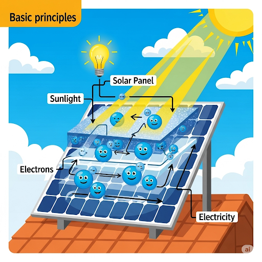 Die Sonne schickt ihre Strahlen zur Erde, die aus winzigen Teilchen bestehen, die Photonen genannt werden. Diese Photonen fliegen wie kleine Bälle zu uns und treffen auf die Sonnenkollektoren.
