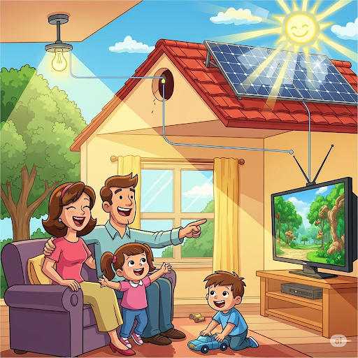 Und da ist er, unser Strom, zu Hause angekommen! Jetzt können wir das Licht einschalten, fernsehen, Computerspiele spielen und unsere Handys aufladen. Und das alles dank der Sonne!