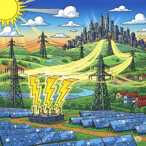 Vom Solarkraftwerk fließt der Strom durch Leitungen, wie Flüsse, in Städte und Dörfer. Diese Leitungen hängen an hohen Masten, die du sicher schon gesehen hast.