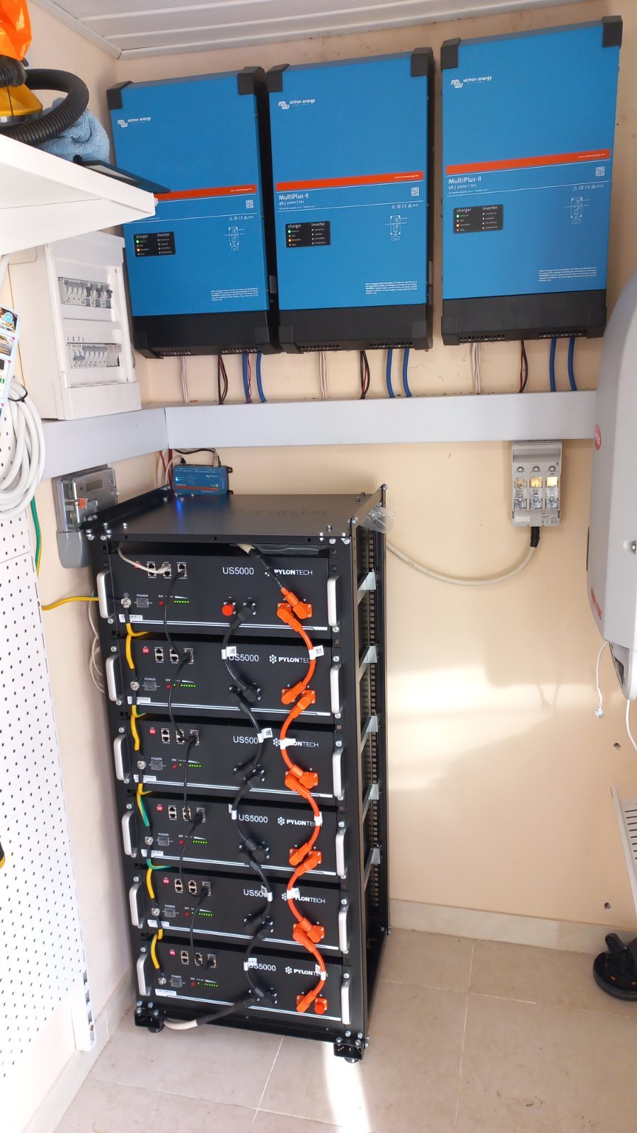 • Три інвертори Victron MultiPlus 5000: Ці інвертори генерують змінний струм з постійного, що дає потужність 15 кВт.