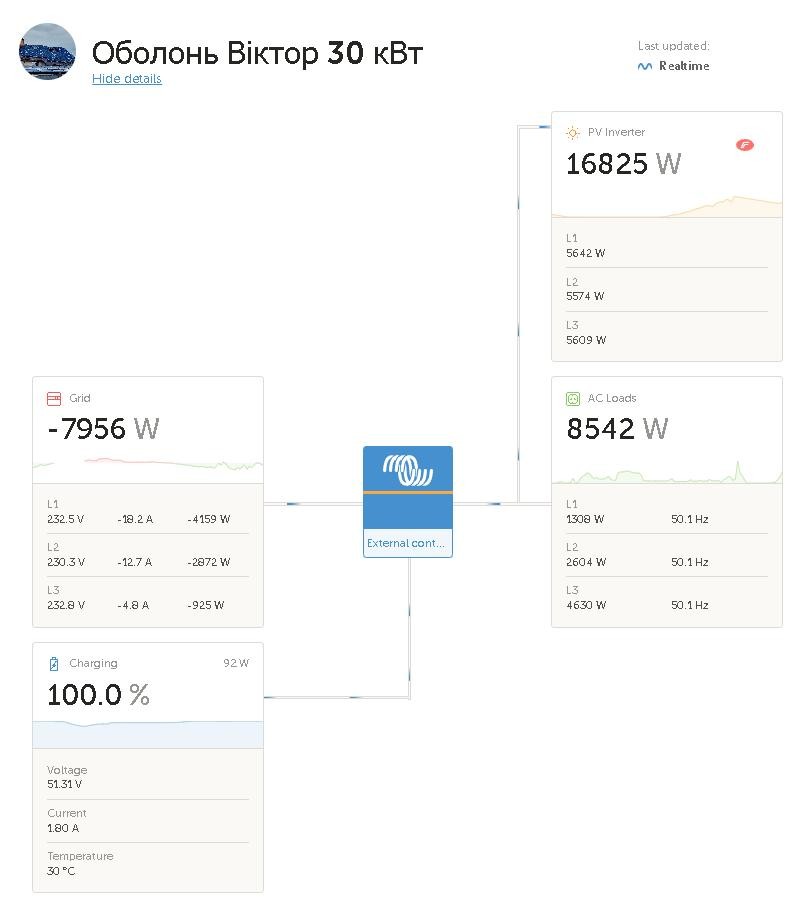 Система складається з сучасного обладнання від провідних виробників — Victron Energy та Fronius, що забезпечує високу ефективність та надійність роботи.